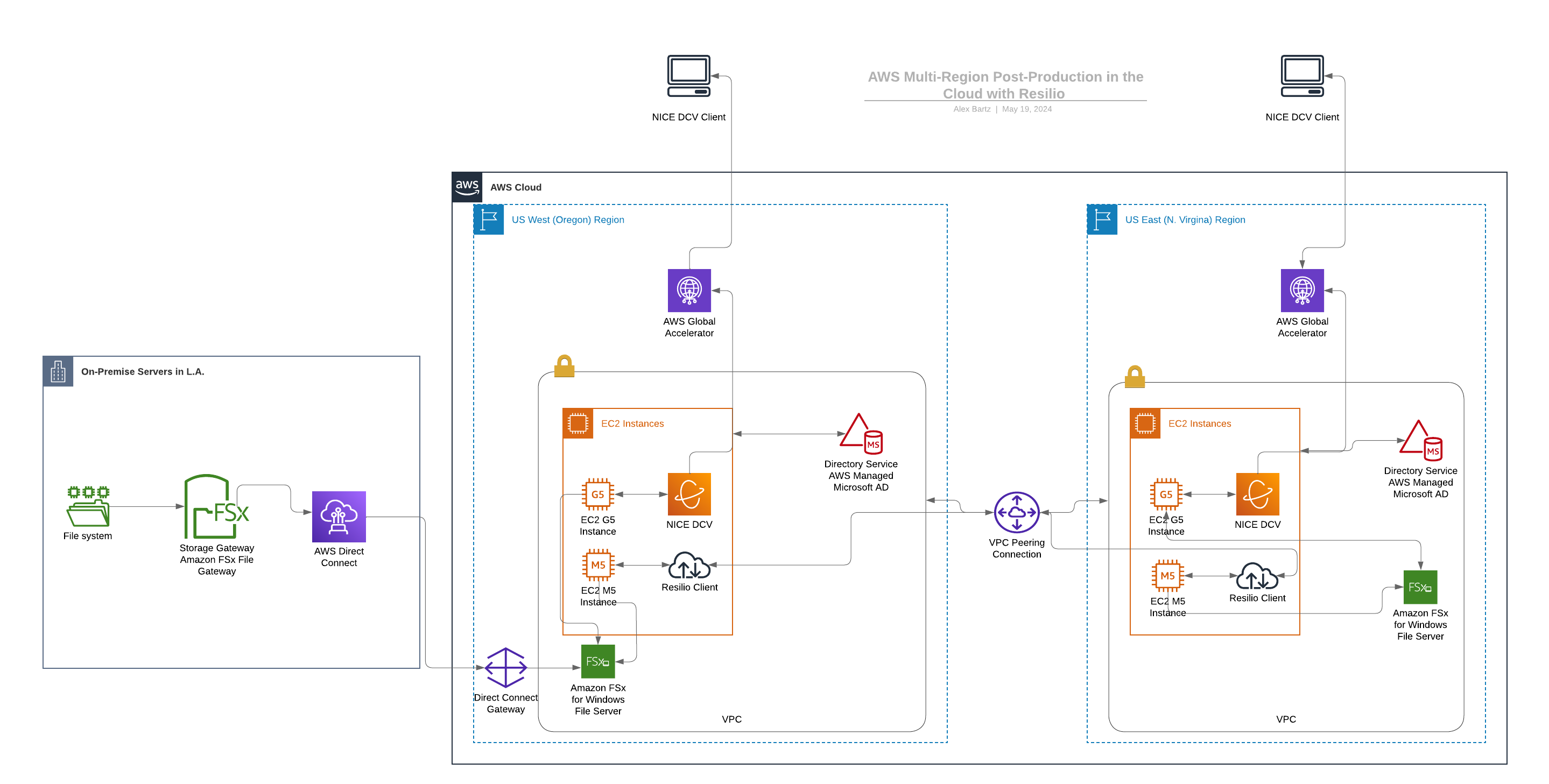 By deploying this architecture across multiple regions, we create a highly available, scalable, and performant post-production environment that can be accessed anywhere in the world. Combining local connectivity through AWS Direct Connect, seamless data synchronization with Resilio, and high-performance video editing with EC2 G5 instances and NICE DCV enables teams to collaborate efficiently and deliver projects faster.